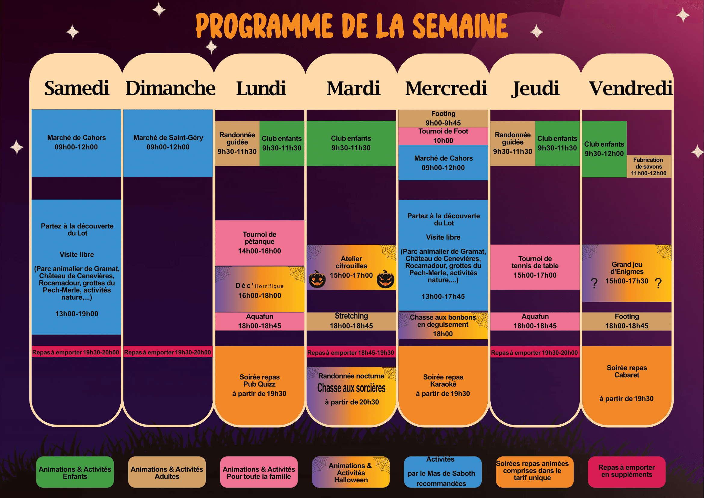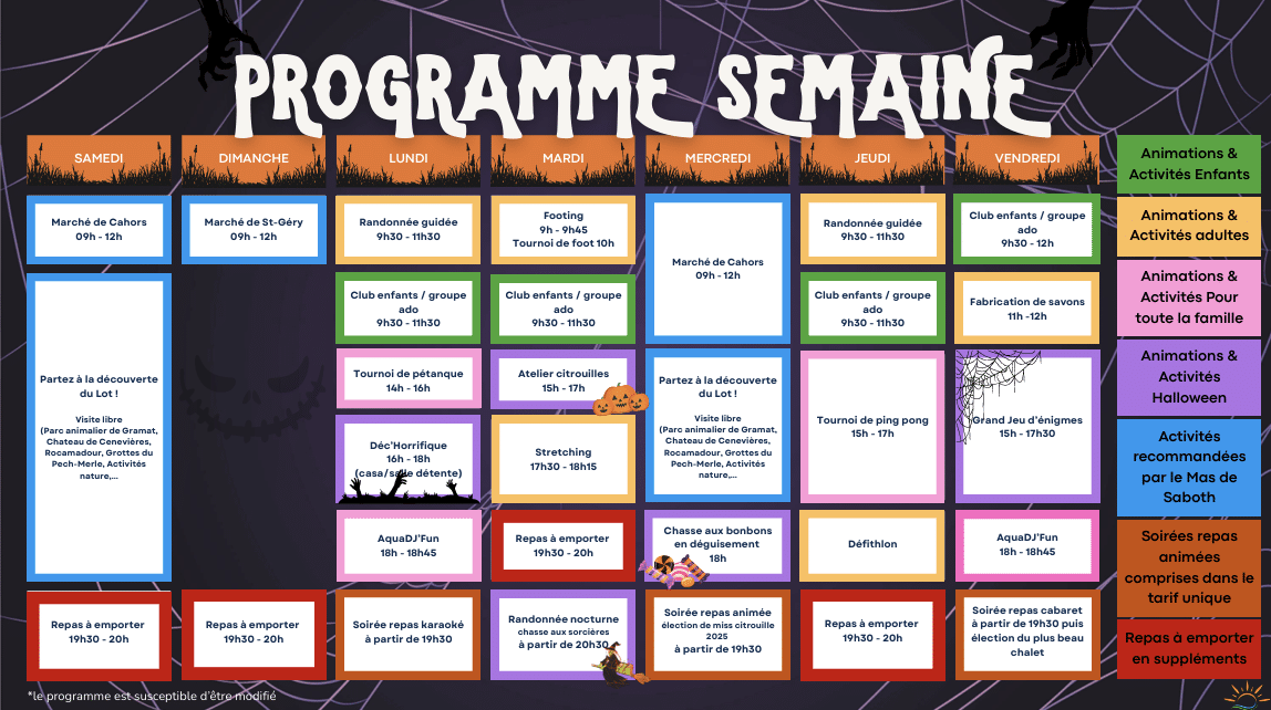 Randonnées guidées, aquafun, footing… Chasse aux bonbons, Election de Miss Citrouille, Clubs enfants, Chasse aux sorcières, Grand jeu d’énigmes… Il y en a pour tous les goûts ! N’hésitez pas à jeter un coup d’œil au programme !